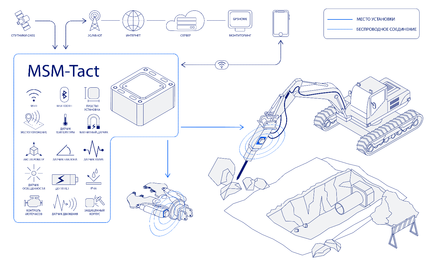 ЗАДАЧАКомпания-заказчик использует несколько мощных гидромолотов, установленных на экскаваторы. Хотя на экскаваторах присутствует система контроля их работы, она не предоставляет данных о работе гидромолотов. В результате отсутствует информация о времени работы экскаватора с гидромолотом, о том, какой именно гидромолот используется, а также о продолжительности серий ударов, которые допускают операторы. Критической проблемой являются длинные серии ударов продолжительностью более 15 секунд, приводящие к повышенному износу и риску поломки гидромолота. Особенно опасны такие серии при неправильном положении оборудования — это может вызвать повреждение не только самого гидромолота, но и его пики. Однако выявить операторов, нарушающих требования эксплуатации, невозможно, так как текущая система не контролирует параметры работы гидромолотов. Из-за неправильной эксплуатации возникают дорогостоящие поломки, а отсутствие данных о виновниках усложняет решение проблемы. Это приводит не только к затратам на сервисное облуживание и ремонт, но и к простоям в выработке щебня, что наносит компании значительные финансовые потери. Для устранения этих недостатков компания «ГлобалСат» разработала специализированный трекер, который фиксирует все параметры работы гидромолота и передает их на сервер мониторинга GPShome.ru. Это решение позволит контролировать эксплуатацию оборудования, выявлять нарушения и снижать риски преждевременных поломок. РЕШЕНИЕКомпания «ГлобалСат» предлагает специализированный трекер активов MSM-Tact, предназначенный для работы в экстремальных условиях. Устройство оснащено высокоемкостной батареей, выдерживает ускорения до 32G и сохраняет работоспособность при любых погодных условиях. Для обеспечения максимальной защиты трекер вместе с аккумулятором помещен в прочный двойной корпус, залитый эпоксидной смолой. Конструкция выполнена по принципу матрешки с пенополиуретановой прокладкой между слоями, которая эффективно гасит вибрации и удары. Трекер крепится непосредственно на гидромолот при помощи четырех винтов и оснащен встроенной батареей, обеспечивающей автономную работу в течение нескольких лет. В устройстве установлен высокочувствительный акселерометр, который фиксирует все ускорения, наклоны, удары и серии ударов гидромолота, включая их продолжительность. Все данные сохраняются во внутреннюю память с возможностью последующей передачи на сервер мониторинга GPShome.ru. Объем памяти позволяет хранить информацию о работе оборудования за несколько лет. Гибкость настроек трекера позволяет регулировать частоту передачи данных на сервер. Пользователь может выбрать любой интервал – от ежечасной отправки до еженедельной или полностью отключить автоматическую передачу, сохраняя данные в памяти и выгружая их только по запросу. Дополнительный магнитный датчик обеспечивает возможность внеочередной передачи информации и получения команд с сервера. Трекер поддерживает несколько способов связи: встроенные модули Wi-Fi и Bluetooth позволяют передавать данные через мобильный телефон, а спутниковая навигация GPS/GLONASS в сочетании с сотовыми вышками гарантирует точное определение местоположения даже в условиях отсутствия спутникового сигнала. Вся информация, переданная на сервер GPShome.ru, отображается в личном 